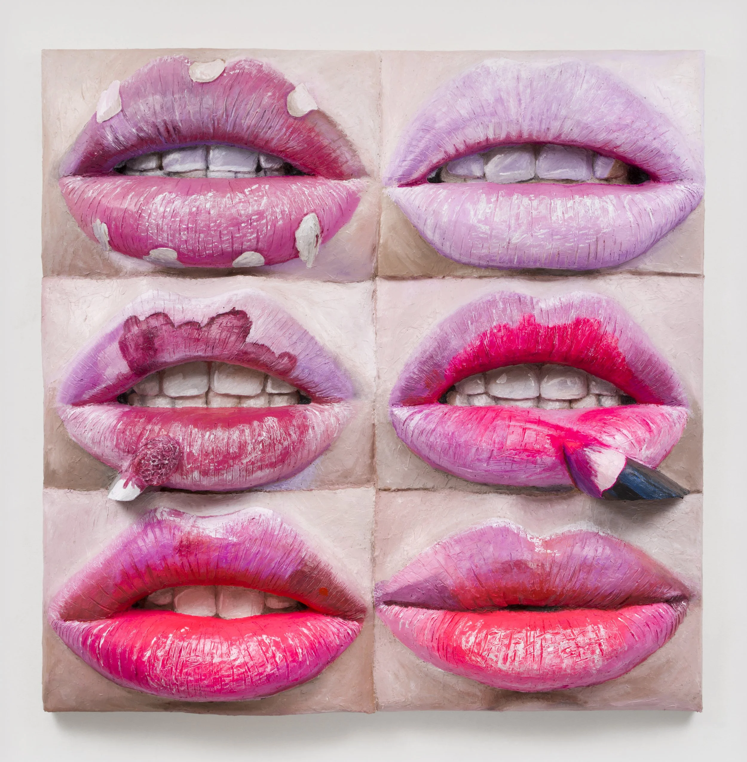 Your works often depict hyper-detailed surfaces — skin, frosting, makeup. What is your relationship to tactility and desire?