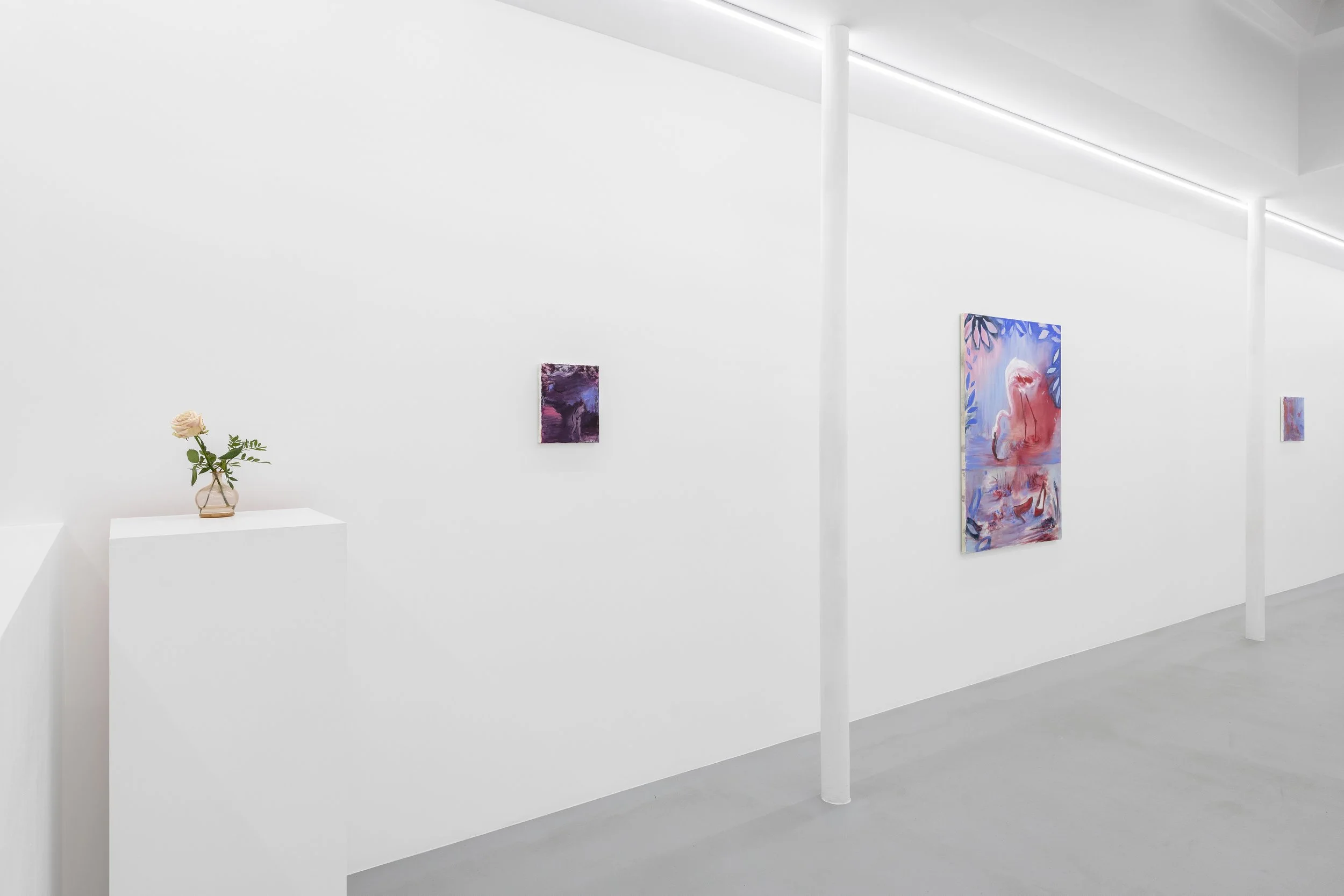 There is also a lot of performativity within the paintings, my identical twin sister models for me, allowing me to be both in and out of the paintings. A doubling takes place, I become her in the context of the painting.